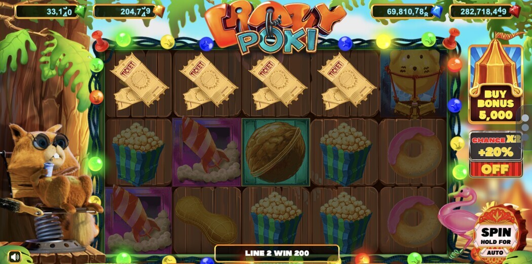 In April 2022, Crazy Poki online slot was presented with a funny chipmunk as the main character. Its main theme was the circus, which was reflected in the main symbols. Among them were tickets, popcorn, candy in colorful packaging and donuts.
